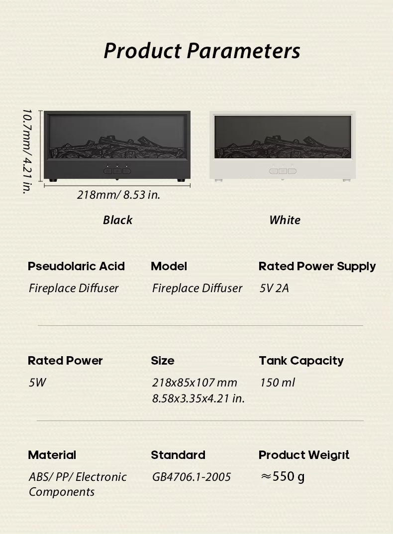- Éclairage : Effet flamme LED multicolore (statique ou à cycle automatique)
