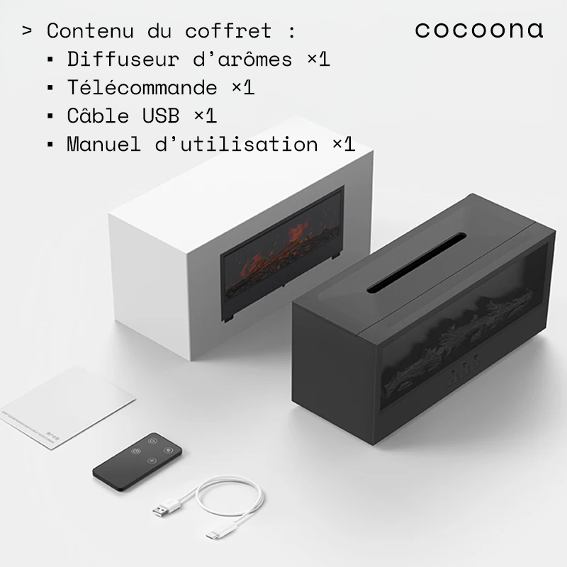 Le Cocoona Firelight crée l'illusion d'une cheminée chaleureuse tout en diffusant une douce brume d'huiles essentielles, transformant ainsi n'importe quel espace en un havre de paix et d'accueil.